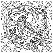 A coloring page of a bird surrounded by flowers