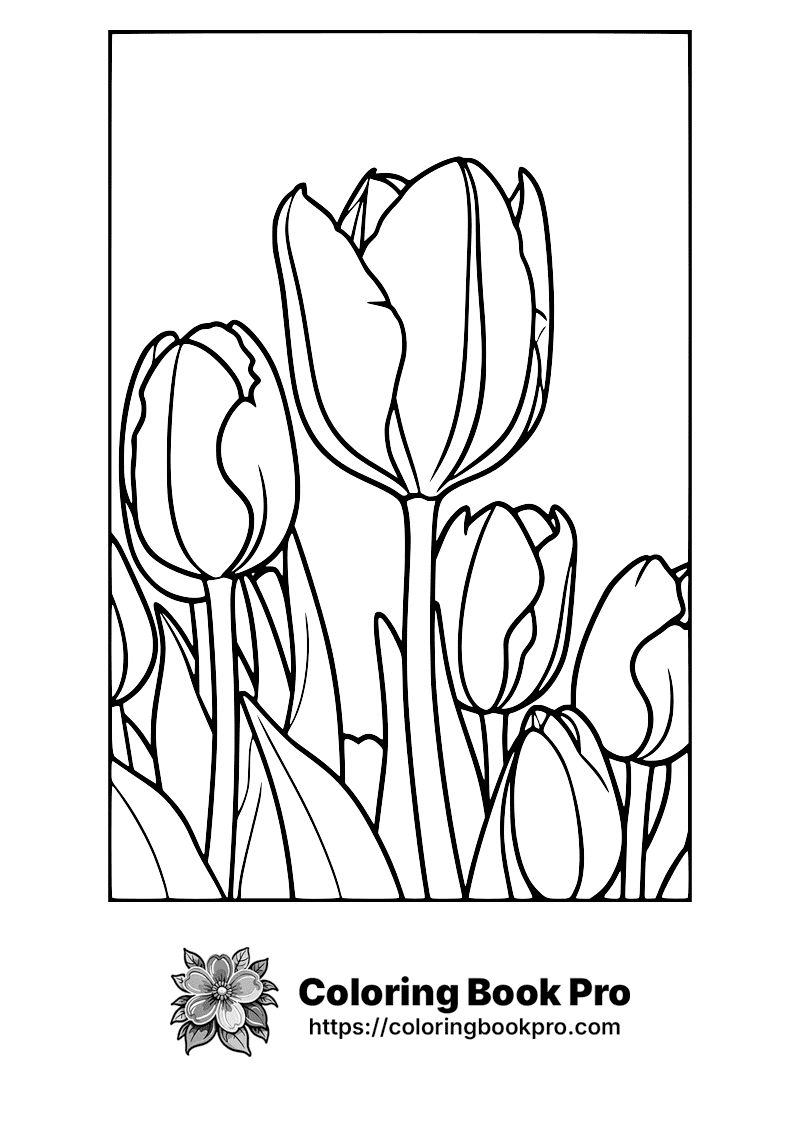 This is a black and white line drawing of several tulips, likely intended as an illustration for coloring or a simple botanical sketch. The central focus is on the large, upright flower that has its petals fully open to reveal their distinct shape with visible vertical lines suggesting veins. To the left, another tulip bud shows its rounded form at the base of its stem. In front of it are other flowers: one appears partially closed, while others show different stages of bloom from tightly curled buds to more open blossoms. All the plants have long stems and leaves drawn clearly beneath them against a plain background. The style uses clean outlines without shading or color fill, emphasizing shapes and forms rather than realistic details like texture or shadows. This minimalist approach makes it ideal for use in educational materials, children's books, or as part of a garden-themed design project.
