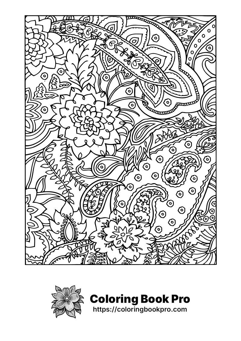 A black and white coloring page is shown. There are flowers and leaves on the page. There is a paisley design in the image. The coloring page has many lines and shapes.