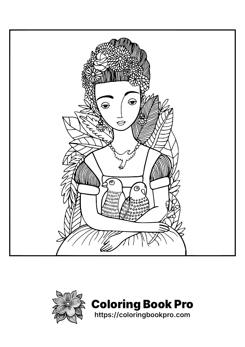 This is an intricate black and white line drawing of a woman, likely intended as a coloring page or illustration for art appreciation. She has a serene expression with simple eyes that gaze forward. Her hair is styled into a high bun adorned with numerous flowers and leaves, creating the appearance of a floral crown. The woman wears a dress with short sleeves featuring patterns resembling stripes on her shoulders, which are framed by large decorative feathers at each shoulder. Around her neck hangs a delicate necklace shaped like a small bird's head. She holds two birds gently cradled in her arms; one appears to be a dove with smooth lines indicating its plumage while the other looks more owl-like, detailed with circular spots across its body. A single leafy branch extends from behind her right ear down toward her chest area. Behind her back stands another feathered element extending outwards—this could represent part of a cloak or ornate fabric design. There also appear to be vines wrapped around parts of her attire, possibly suggesting