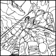 A black and white drawing of a robot